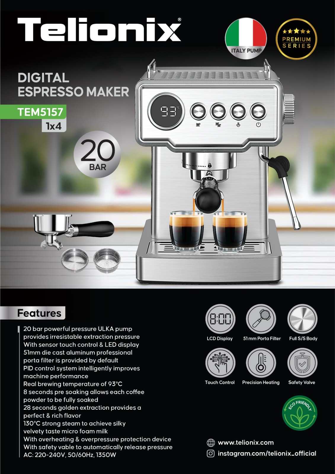 دستگاه اسپرسوساز ۲۰ بار تلونیکس مدل TEM5157 – انقلابی در طعم و دقت