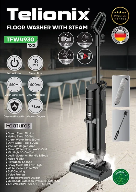 جارو، تی و بخارشو Telionix TFW4930 یک دستگاه فوقپیشرفته و چندمنظوره است که برای نظافت حرفهای خانههای مدرن طراحی شده است. این دستگاه سه عملکرد مهم جارو کردن، شستوشوی کف و بخاردهی ضدعفونیکننده را بهطور همزمان انجام میدهد و امکان نظافت کامل و عمیق را تنها در یک مرحله فراهم میسازد.