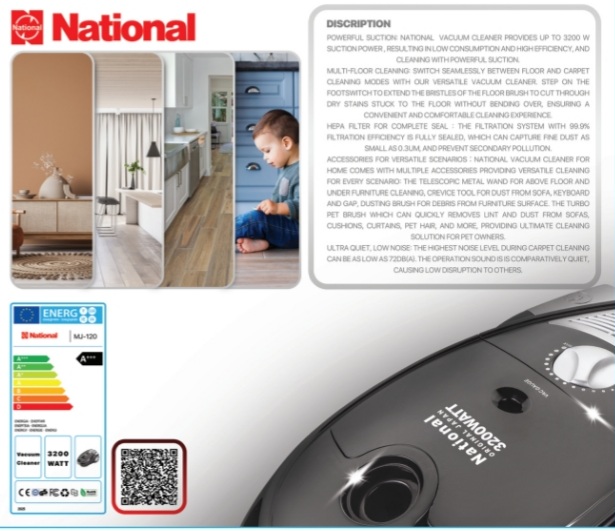 جاروبرقی ناسیونال MJ-120 دارای برچسب مصرف انرژی A+++ بوده و در کنار قدرت بالا، مصرف برق اقتصادی دارد که باعث کاهش هزینههای انرژی در بلندمدت میشود.