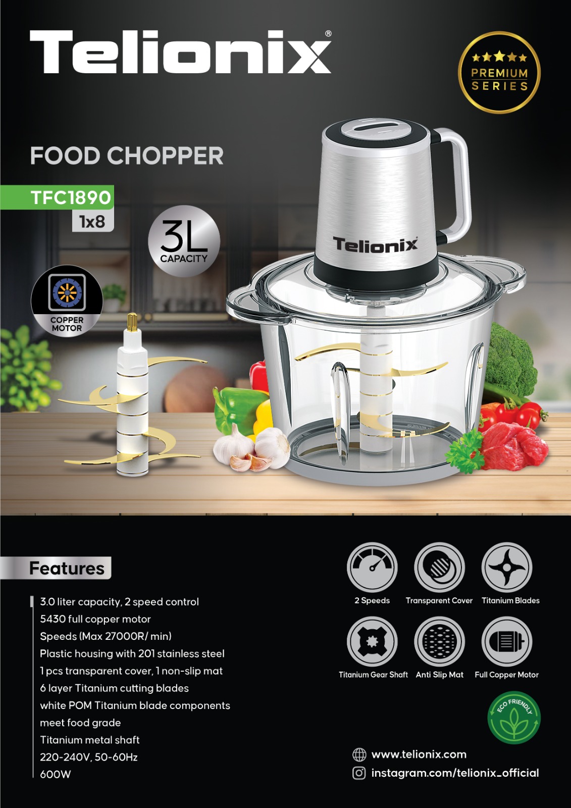خردکن تلیونیکس مدل TFC1890 یک دستگاه همهکاره و باکیفیت است که برای انجام طیف وسیعی از کاربردها در آشپزخانه طراحی شده است. ظرفیت کاسه 3 لیتری آن امکان پردازش حجم مناسبی از مواد غذایی را به شما میدهد. این دستگاه دارای 6 تیغه تیتانیومی بسیار تیز و بادوام است که به راحتی و در کسری از ثانیه سختترین مواد را خرد و آسیاب میکند.