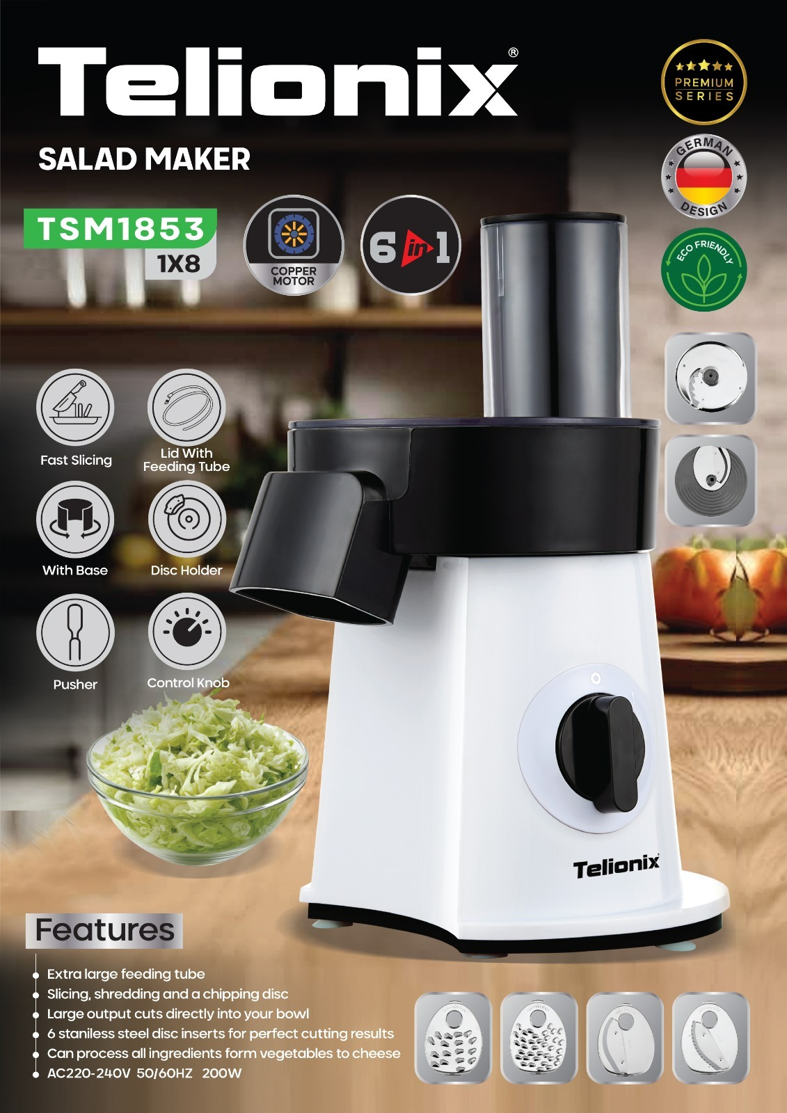 سالادساز Telionix مدل TSM1853 یک دستگاه قدرتمند و کاربردی برای رندهکردن، ورقهکردن، خردکردن و چیپسسازی انواع مواد غذایی است. این مدل با موتور مسی، ۶ دیسک استیل ضدزنگ و لوله ورودی بسیار بزرگ طراحی شده تا کار تهیه سالاد و آمادهسازی مواد غذایی را سریعتر و دقیقتر انجام دهد.