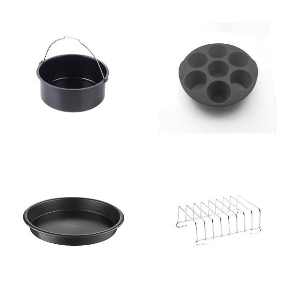 لوازم جانبی همراه شامل ظرف کیک ،پیتزا ،قالب کاپ،توری استیل برای انواع غذا و دسترها