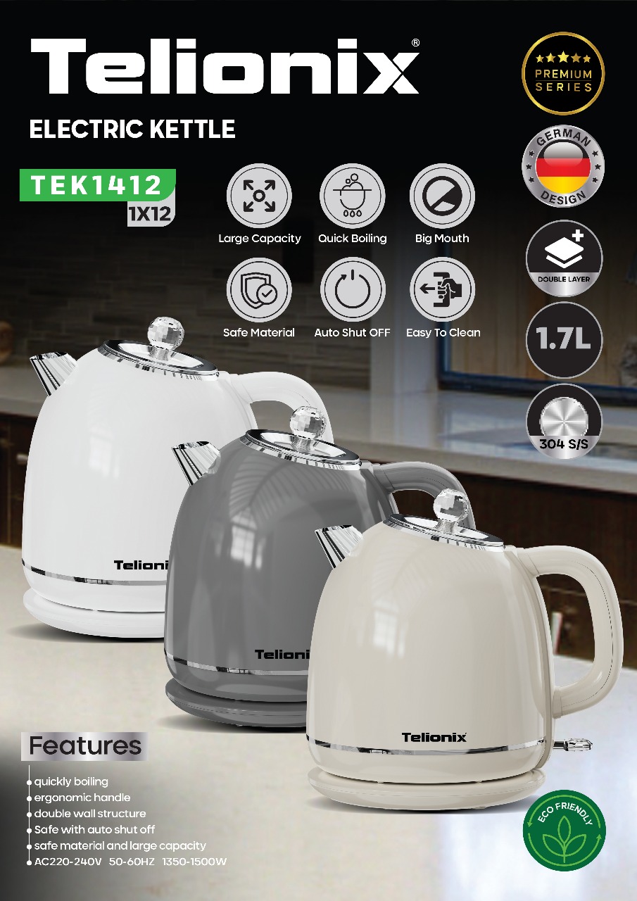 کتری برقی Telionix مدل TEK1412 یک محصول زیبا، بادوام و کارآمد است که با طراحی مدرن و کیفیت ساخت بالا، تجربهای متفاوت از جوشآوری سریع و استفاده ایمن را فراهم میکند.
