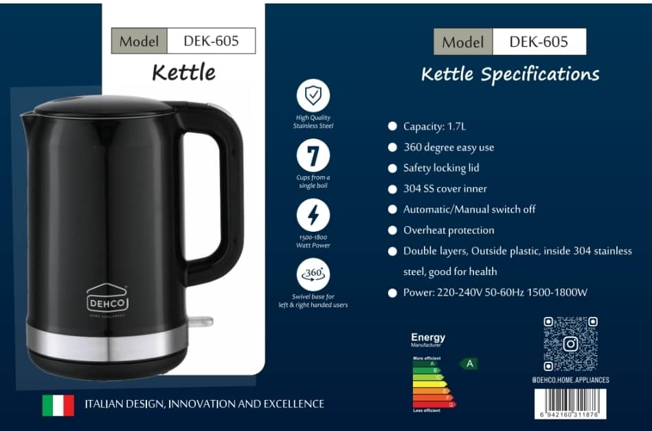 کتری برقی دکو (DEHCO) مدل DEK-605 یکی از محصولات باکیفیت و بادوام در دسته کتریهای برقی مدرن است که با طراحی ایتالیایی، مصرف انرژی استاندارد و ساختار دولایه مقاوم، تجربهای ایمن و سریع را هنگام جوشآوردن آب فراهم میکند.